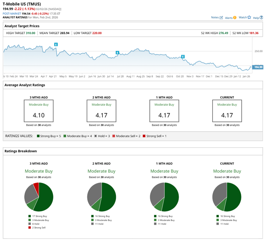 Among the 30 analysts covering TMUS stock, the consensus is a “Moderate Buy.” That’s based on 16 “Strong Buy” ratings, three “Moderate Buys,” and 11 “Holds.”