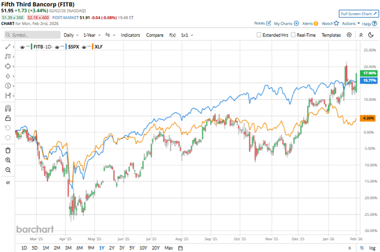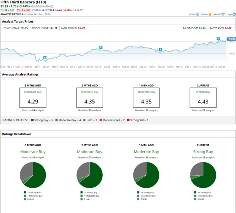Strong investor sentiment has propelled the stock to new heights. The stock has increased 17.2% over the past 52 weeks, while the broader S&P 500 index ($SPX) has gained 15.5%. Over the past six months, the outperformance has become even more pronounced: the stock is up 27%, while the index is up 11.8%. FITB’s shares reached a 52-week high of $53.33 on Jan. 22, but are down 2.6% from that level.