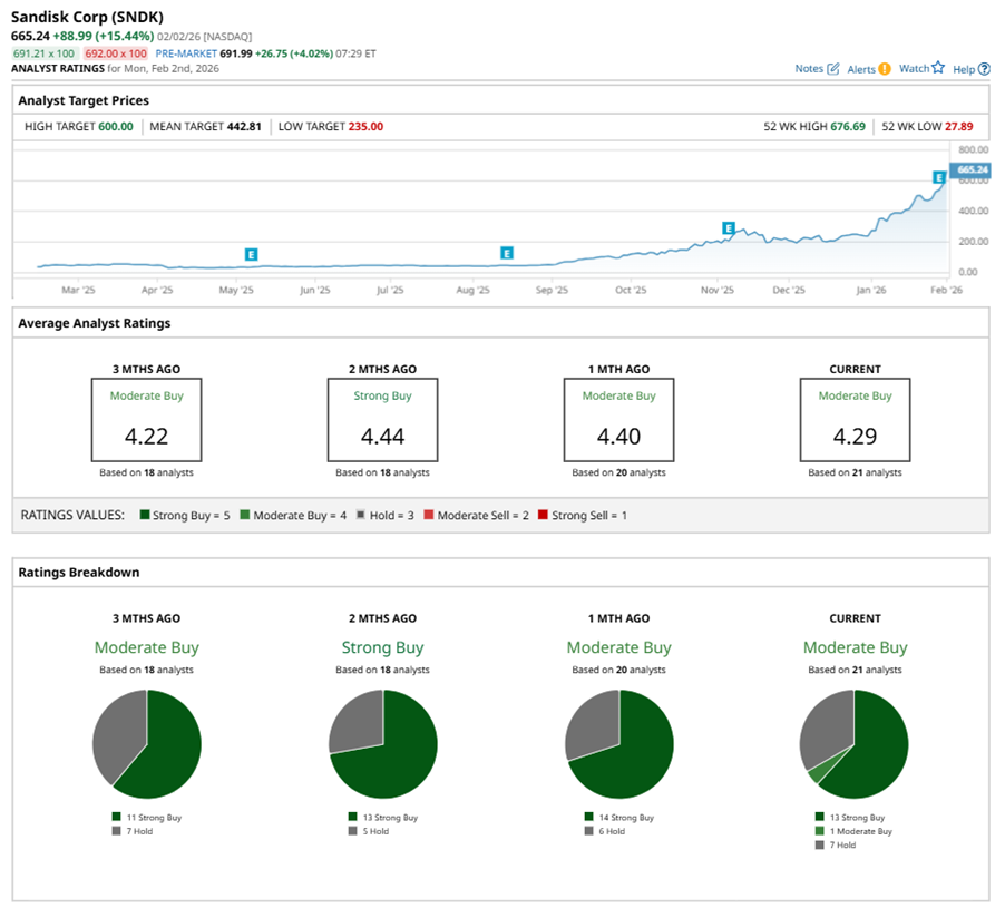 On Jan. 30, Morgan Stanley (MS) analyst Joseph Moore reiterated a “Buy” rating on SNDK and boosted the price target to $690, implying a potential upside of 3.7% from current levels.